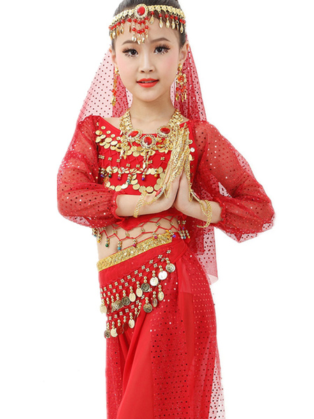 Belly Dance Costume Kids Red Chiffon Long Sleeve Indian Bollywood Dancing Costumes & Costumes > Costumes > Dance Costumes > Belly Dance Costumes