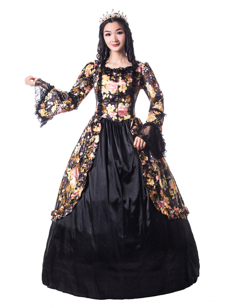 Black Retro Costumes Women Floral Print Bow Lace Ruffle Matte Satin Dress Victorian Era Style Vintage Clothing Halloween & Costumes > Costumes > Retro Costumes > Retro Costumes For Woman