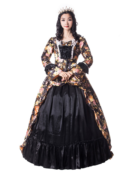 Home / Fashion / Costumes / Black Retro Costumes Women Floral Print Bows Matte Satin Pageant Dress Victorian Era Style Vintage Clothing Halloween