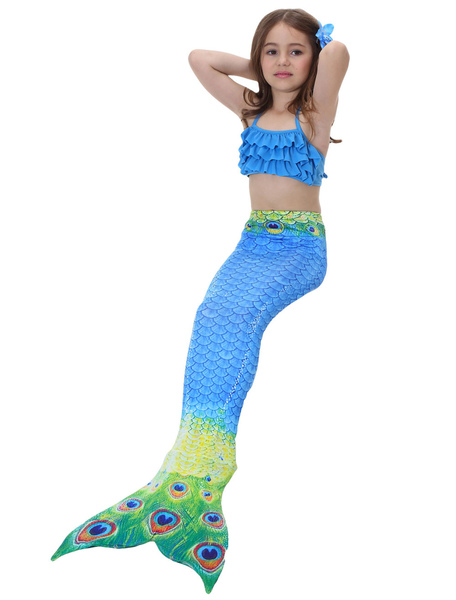 Mermaid Tail Costume Kids Peacock Printed Blue Little Girls Bathing Swimming Suit